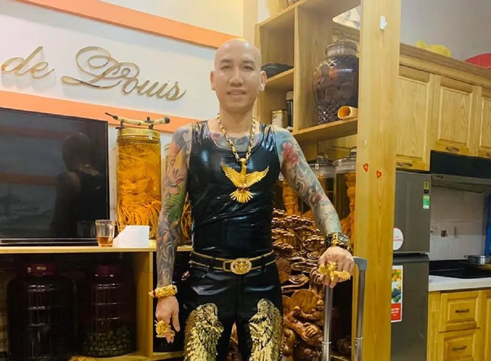 Phú được giới trẻ biết đến với chiếc đầu trọc, cơ thể phủ kín những hình xăm, đeo rất nhiều vàng. Ảnh: FB Phú Lê
