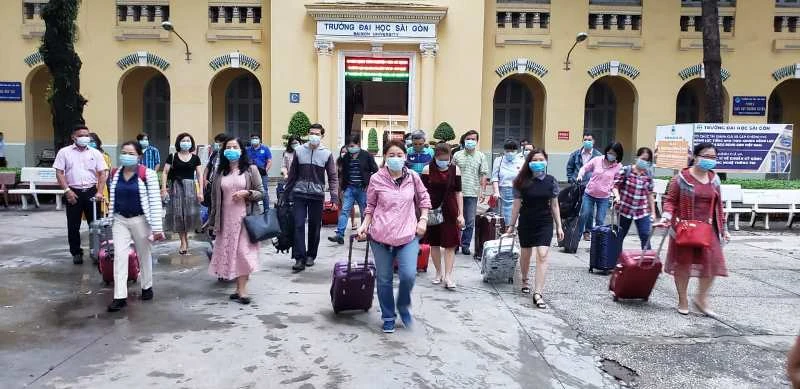 Tại Trường ĐH Sài Gòn, trường đã bố trí 2 xe loại 30-45 chỗ để đưa hơn 60 cán bộ, giảng viên của trường tới Đồng Tháp làm nhiệm vụ thi tốt nghiệp THPT. Mỗi cán bộ đều được kiểm tra thân nhiệt, đeo khẩu trang trước khi lên xe.