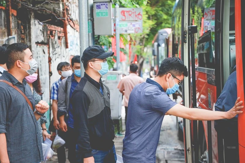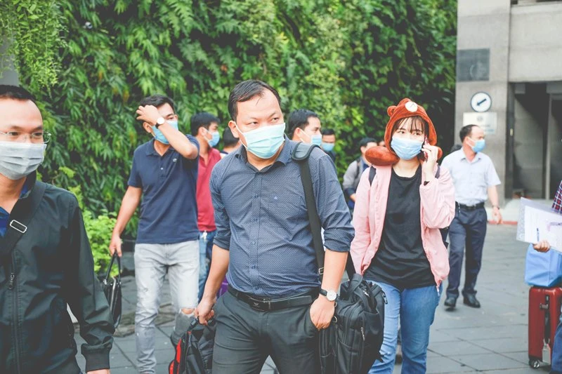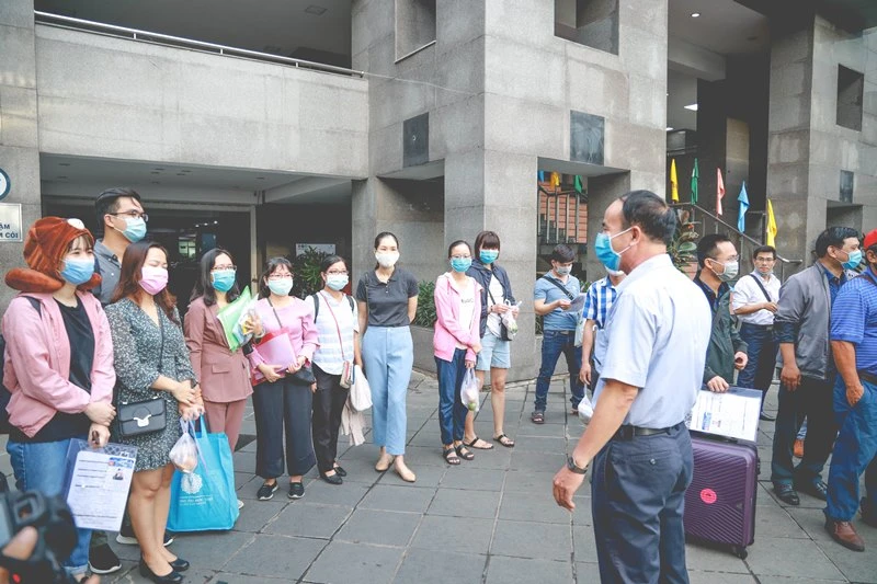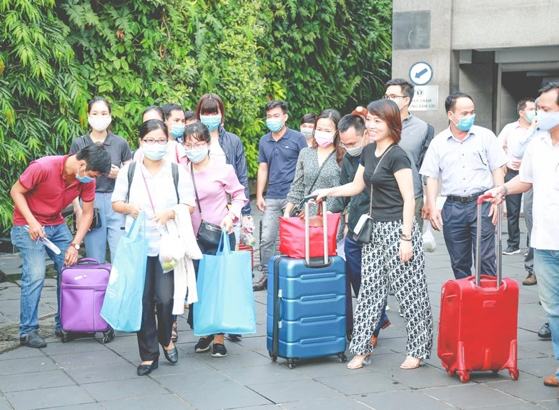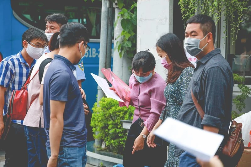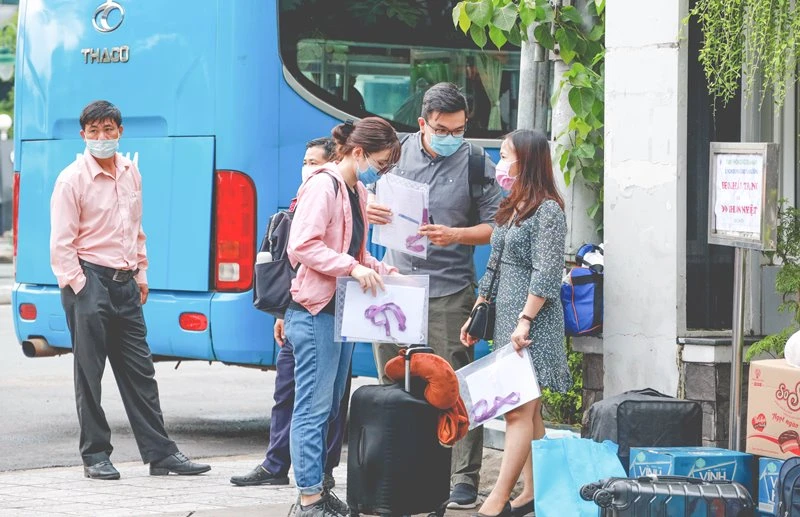 Do đang trong đợt cao điểm dịch COVID-19, mọi người ai nấy đều đeo khẩu trang, tay xách nách mang hành lý lên xe để làm nhiệm vụ từ nay đến hết kỳ thi.