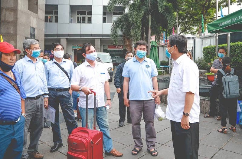 PGS.TS Trần Hoàng Hải, Phó hiệu trường nhà trường (áo trắng) có mặt để dặn dò các thầy cô trước khi lên đường làm nhiệm vụ thi. Ảnh: NTCC