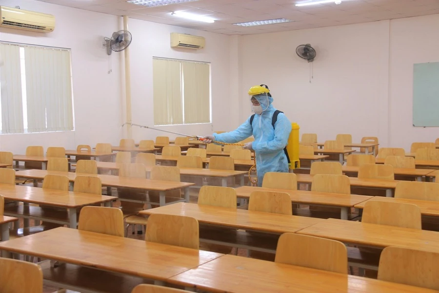 Trường ĐH Ngân hàng TP.HCM tiến hành khử khuẩn các phòng học trong đợt dịch vừa qua. Ảnh: FBNT
