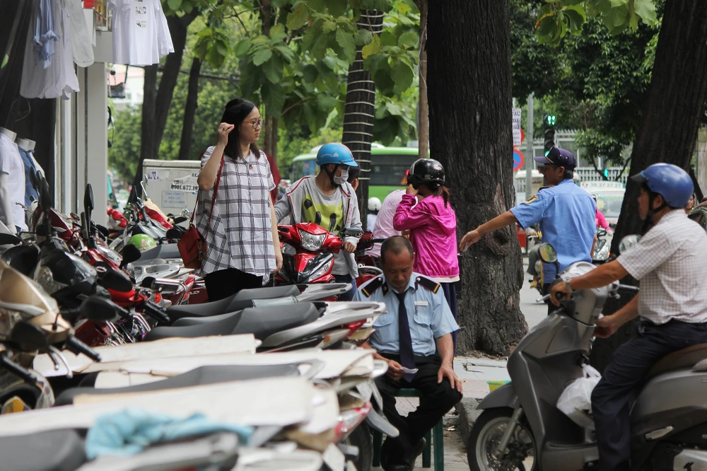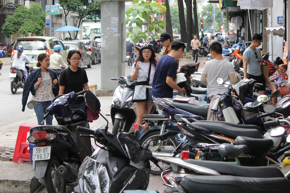 Du khách ngán ngẫm đi len lõi giữa xe cộ đậu trên vỉa hè đường Lý Tự Trọng.