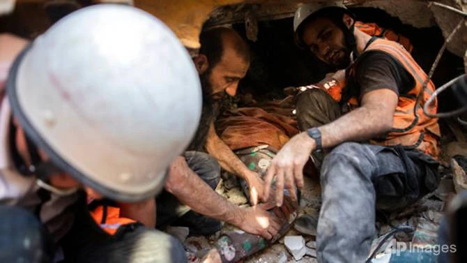Lực lượng cứu hộ Palestine tìm cách đưa thi thể một phụ nữ từ dưới đống đổ nát của một tòa nhà bị phá hủy sau cuộc không kích của Israel ở Dải Gaza vào ngày 16-5. Ảnh: AP