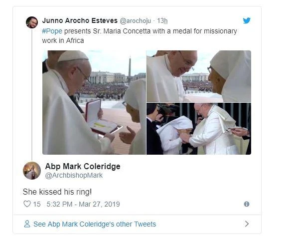 Trước đó, một số người Công giáo bảo thủ cho rằng Giáo hoàng Francis đã từ bỏ giáo lý nhà thờ và thấy ngài né tay khỏi những con chiên mong hôn lên nhẫn để thể hiện niềm tin và sự kính trọng với người "được Chúa lựa chọn".