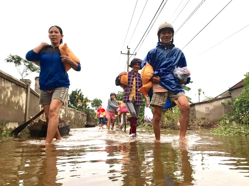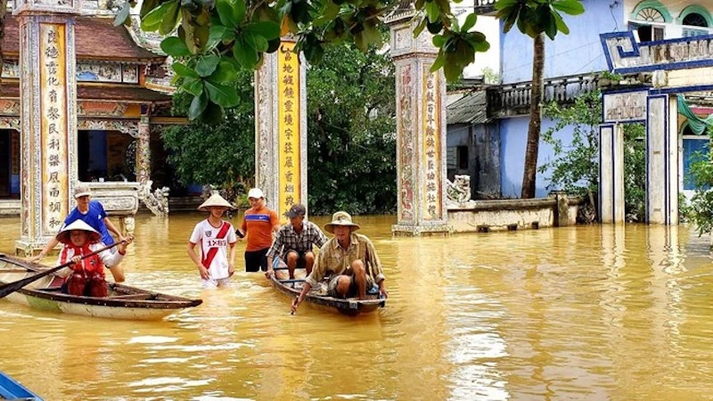 Người dân thôn An Xuân (xã Quảng An, huyện Quảng Điền, Thừa Thiên-Huế) đi ghe ra nhận quà của đoàn cứu trợ Báo Pháp Luật TP.HCM. Ảnh: Nhóm PV miền Trung