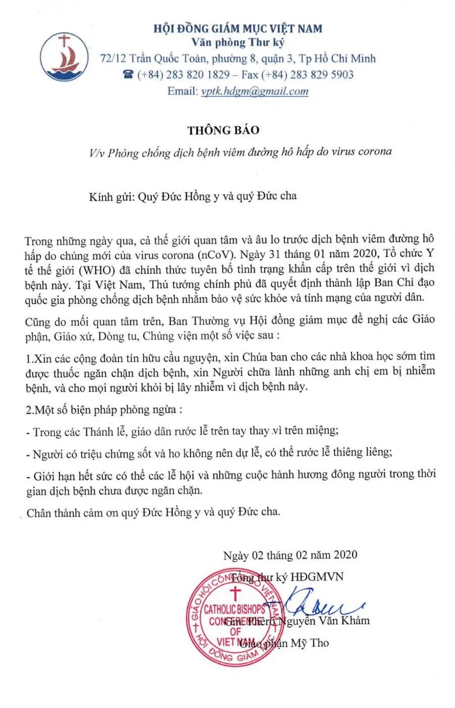Ngày 2-2, Đức Giám mục Phêrô Nguyễn Văn Khảm, Tổng thư ký Hội đồng Giám mục Việt Nam, đã ký thông báo gửi đến các giáo phận, giáo xứ, dòng tu, chủng viện.