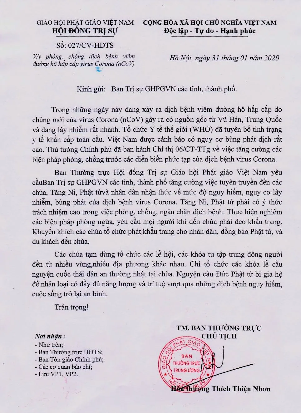 Trước đó, ngày 31-1, Hòa thượng Thích Thiện Nhơn, Chủ tịch Hội đồng trị sự Trung ương Giáo hội Phật giáo Việt Nam cũng đã gửi thông báo đến ban trị sự Giáo hội Phật giáo Việt Nam các tỉnh, thành.