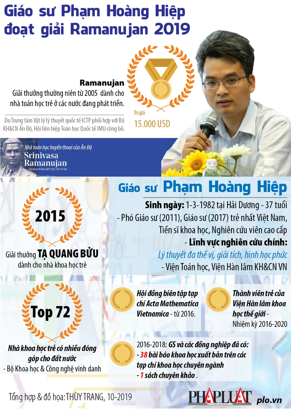 (PLO)- Giải thưởng Ramanujan 2019 ghi nhận đóng góp nổi bật của GS Phạm Hoàng Hiệp trong lĩnh vực lý thuyết đa thế vị nói chung và cho sự tiến bộ của toán học Việt Nam nói riêng.