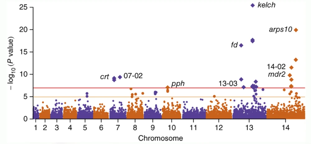 Biểu đồ về tình trạng kháng thuốc Artemisinin (Nguồn: Cấu trúc di truyền của Plasmodium falciparum kháng artemisinin, Nature Genetics 47)