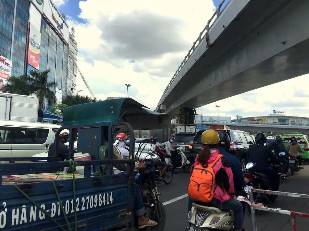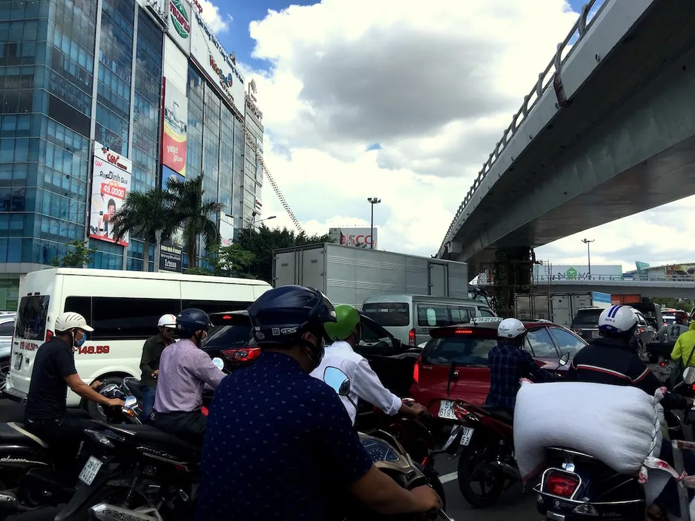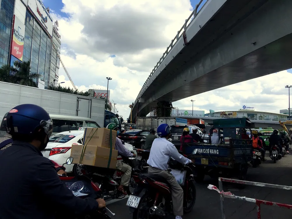 Các phương tiện chen nhau, cắt đầu nhau tại khu vực cầu vượt đang thi công. Ảnh: HỒNG TRÂM