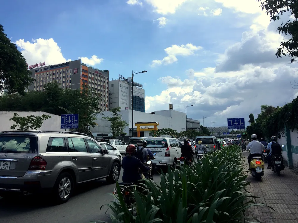 Ở hướng ngược lại, dòng phương tiện đi từ đường Bạch Đằng lớn và Bạch Đằng nhỏ cũng bị ùn ứ. Nhiều người điều khiển xe máy đã chạy lên vỉa hè, cố gắng thoát khỏi dòng phương tiện ùn ứ phía sau.