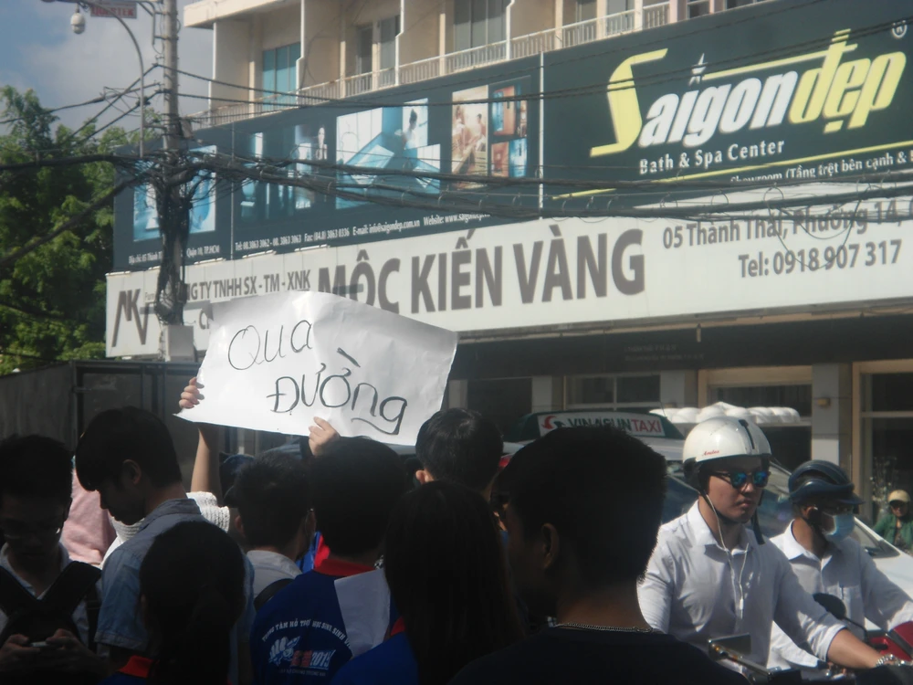 Trước cổng trường THPT Nguyễn Khuyến, 50 Thành Thái, Phường 12, Quận 10 lực lượng tiếp sức mùa thi đã làm một bảng “qua đường” trên giấy roki khổ lớn tập hợp từng đợt thí sinh và phụ huynh để cùng nhau qua đường, đảm bảo an toàn tuyệt đối.