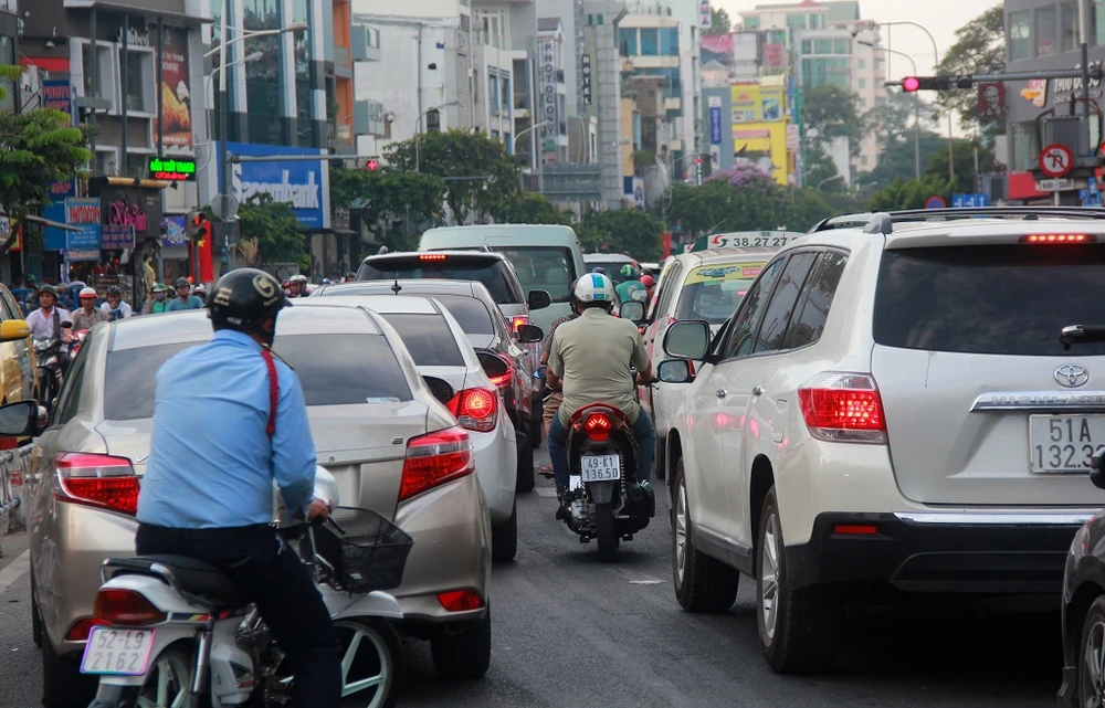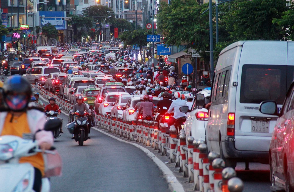 Tại đường Nguyễn Đình Chiểu (quận 3), ùn tắc hàng chục phút khiến các phương tiện bị chôn chân, nhiều người không đủ kiên nhẫn đành luồn lách, đi ngược chiều khiến giao thông càng hỗn loạn.