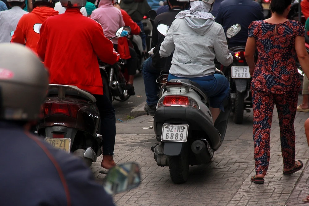 Trên đường Trường Sơn (quận Tân Bình), hàng nghìn xe cộ phải nhích từng chút, chen chúc nhau. Người dân phải chạy xe lên vỉa hè.