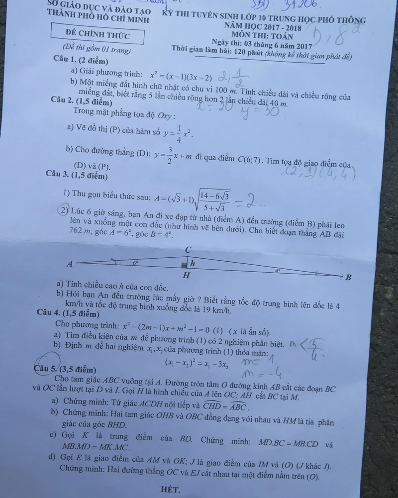 Phần hình học là câu 5 hơi rắc rối khi cho tam giác vuông nội tiếp đường tròn để chứng minh nhiều yêu cầu của đề, kể cả những em học khá cũng khó làm. Hoặc ở phần hai của câu 3, tức phần thực tế, nói về đường từ nhà đến trường thì hầu như HS sẽ bỏ vì các em phải sử dụng tỉ số lượng giác của góc nhọn bằng hàm Tang. “Mặc dù nội dung này các em đã được học nhưng không thông dụng với các em, các em vẫn thường quen với hàm sin, cos chứ Tang là rất ít vì chưa thuận lắm, thường lên THPT các em sẽ thuận hơn, kể cả HS giỏi cũng vậy, cái này thuộc về tâm lý là chính, cứ gặp hàm này là ngại nên rất khó để bắt tay làm nên gần như hầu hết HS trong lớp tôi đều bỏ câu này” - cô Giang nói.