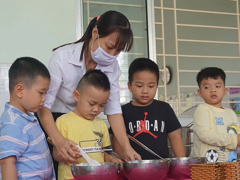 Cô Lê Xuân Hòa, giáo viên Trường Mầm non Anh Đào, quận Gò Vấp, TP.HCM hướng dẫn trẻ trong bữa ăn trưa. Ảnh: NGUYỄN QUYÊN