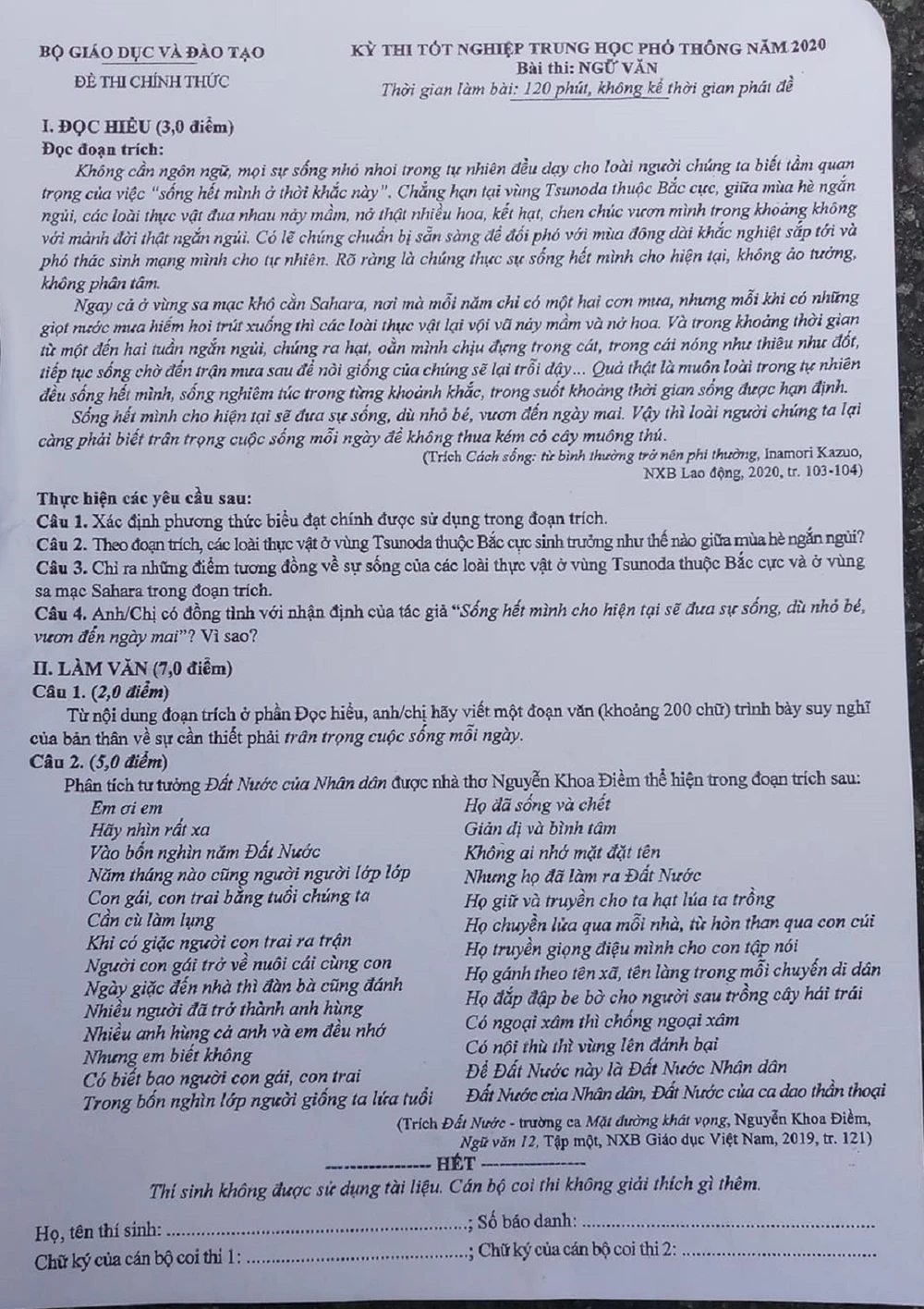 Đề thi Văn trong kỳ thi tốt nghiệp THPT năm 2020. Ảnh: NQ