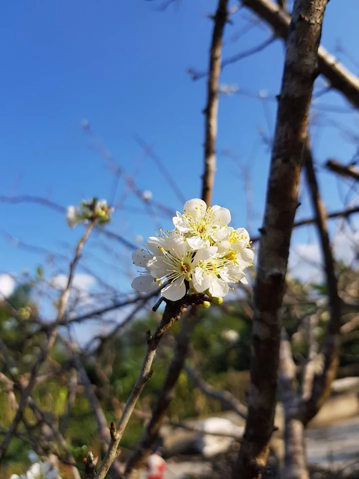Giữa rừng hoa mận, một chùm hoa nở sớm trắng tinh khôi. Ảnh: THÙY DƯƠNG
