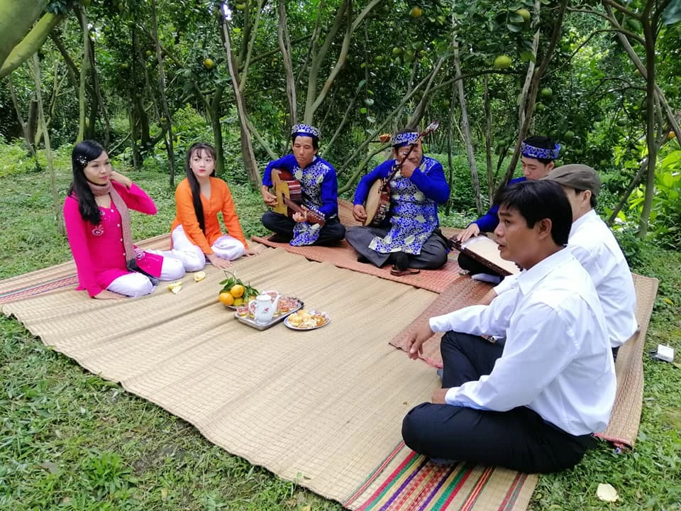 Du khách thưởng thức quýt tại vườn và nghe đờn ca tài tử.