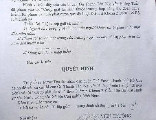 Cáo trạng của VKS cho rằng hành vi phạm tội của Tân, Tuấn là “cướp giật tài sản” thuộc trường hợp "dùng thủ đoạn nguy hiểm" và truy tố cả hai theo Khoản 2, Điều 136 Bộ luật hình sự, với mức hình phạt mỗi đối tượng từ 3-10 năm tù.