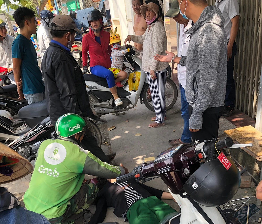 Nạn nhân bị té được người dân đưa vào vỉa hè sơ cứu trước khi chuyển vào bệnh viện. Ảnh: HT