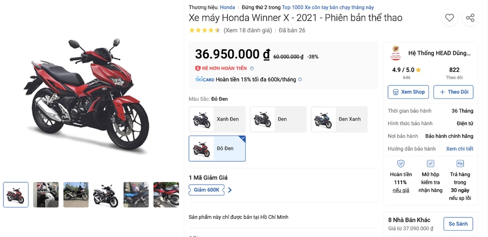 Giống như các mẫu xe máy khác của Honda, Winner được bán trên gian hàng của Tiki với giá rẻ bất ngờ. Đáng chú ý, có phiên bản rẻ hơn giá trực tiếp tại đại lý hơn 2 triệu đồng.
