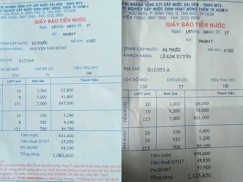 Ngoài ra, một số hộ phản ánh mức tiêu thụ nước trong một tháng gần đây tăng đột biến. Đơn cử, giấy báo sáu tháng gia đình ông Hùng chỉ tiêu thụ 70 khối nước (tương ứng với 478.860 đồng) trong khi giấy báo của riêng tháng 4 lại lên tới 145 khối (tương ứng với 1.082.610 đồng).