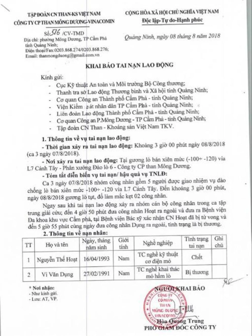 Trước đó, ngày 8-8-2018, tại Công ty CP Than Mông Dương xảy ra vụ tai nạn tụt hầm lò. Công ty này sau đó có công văn gửi các cơ quan chức năng báo cáo tình hình.