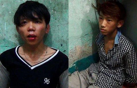 Thân và Hùng (mặc áo carô) khi bị tạm giữ