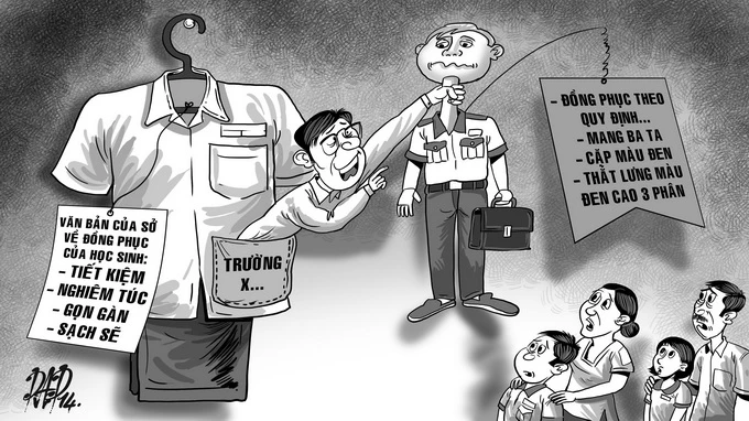 | Đồng phục theo kiểu truyền thống Trong văn bản ngày 11-6-2014 về đồng phục học sinh và các khoản thu trong năm học 2014-2015, Sở GD-ĐT tỉnh Khánh Hòa đã chỉ đạo rất rõ cho các phòng GD-ĐT, các trường THPT và đơn vị trực thuộc sở thực hiện tốt yêu cầu cụ thể như sau: Trong bối cảnh kinh tế xã hội còn nhiều khó khăn như hiện nay, các trường trong toàn tỉnh (trừ các trường ngoài công lập) cần thực hiện đồng phục học sinh theo kiểu truyền thống là quần hoặc váy màu xanh mực, áo trắng, không có các phụ kiện như cà vạt, viền tay áo, cổ áo, cầu vai... khác màu. Học sinh có thể đi giày hoặc dép có quai sau, không bắt buộc thực hiện đồng loạt. |