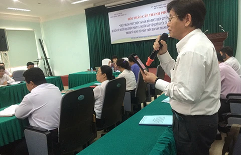Một đại biểu đóng góp ý kiến tại hội thảo nhằm nâng cao quyền bào chữa, quyền có người đại diện pháp lý, người bảo vệ quyền của cá nhân… Ảnh: HỒNG TÚ