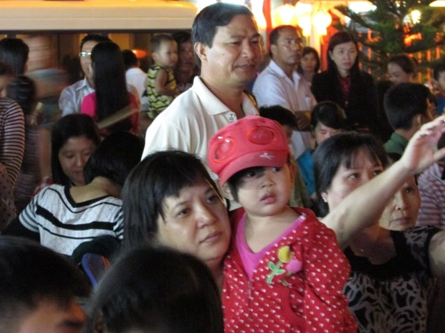 Dù không có ghế ngồi nhưng ba thành viên của gia đình này vẫn rất chăm chú theo dõi các tiết mục của Đêm Thơ. Ảnh: N.NAM