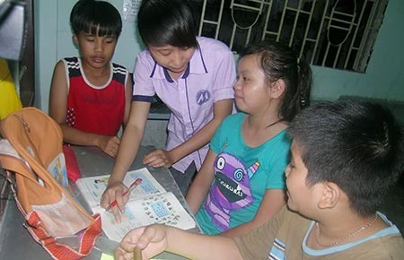 Em Đặng Thị Quỳnh Như, chín tuổi, ở nhà trọ trên đường Tân Hương, quận Tân Phú, đang loay hoay với chiếc lồng đèn ngôi sao. Em cho biết do nhà nghèo nên chưa được đi học bao giờ. “Vậy ai nói cho con biết mà đến đây?” - chúng tôi hỏi. “Con ngày nào cũng vào đây ăn cơm. Một hôm có cô giáo hỏi con có thích đi học không, con nói thích nhưng nhà con không có tiền. Cô nói học không tốn tiền, được cấp sách vở. Vậy là con về nhà nói lại với cha mẹ. Cha mẹ con vui lắm và đã xin cho con đi học. Giờ con đã biết viết tên cha mẹ và con rồi, vui lắm chú à!”.