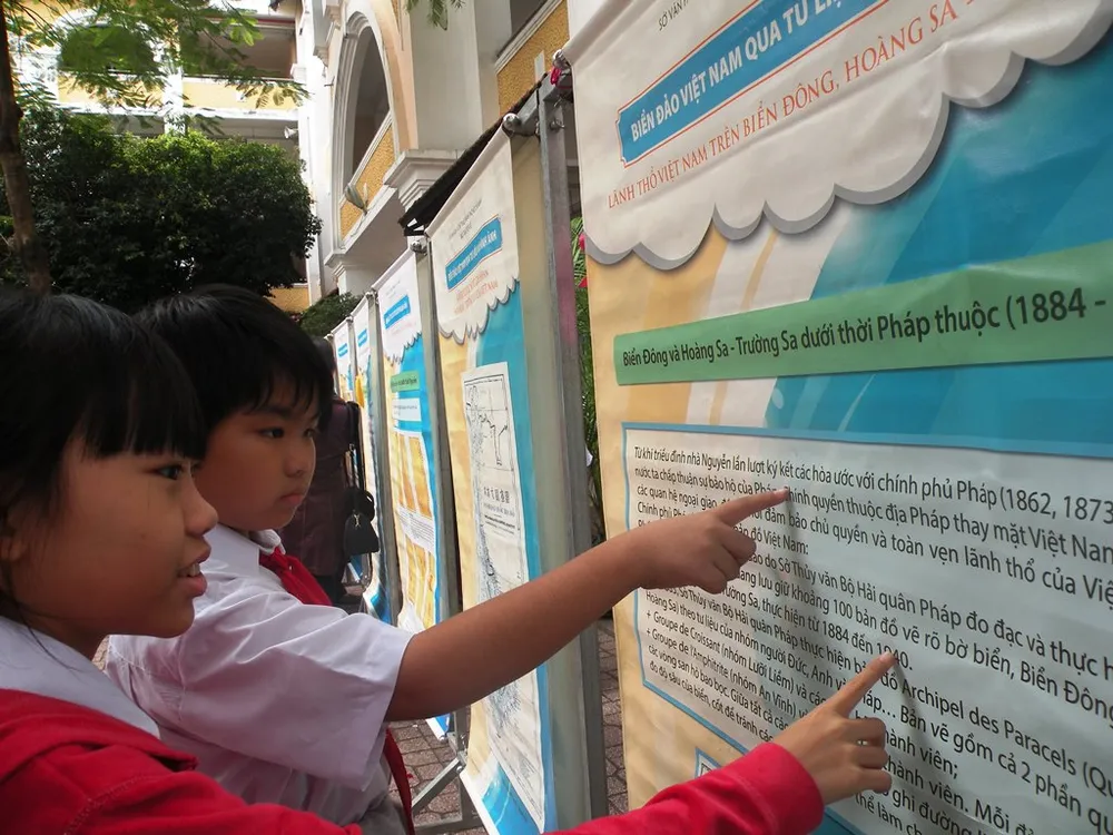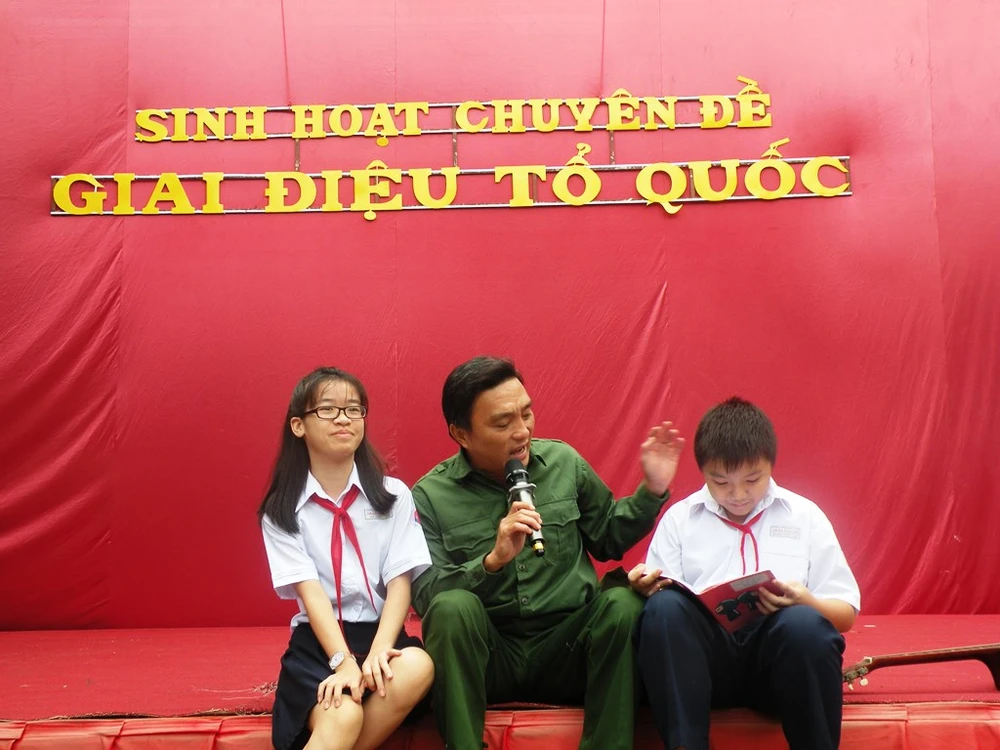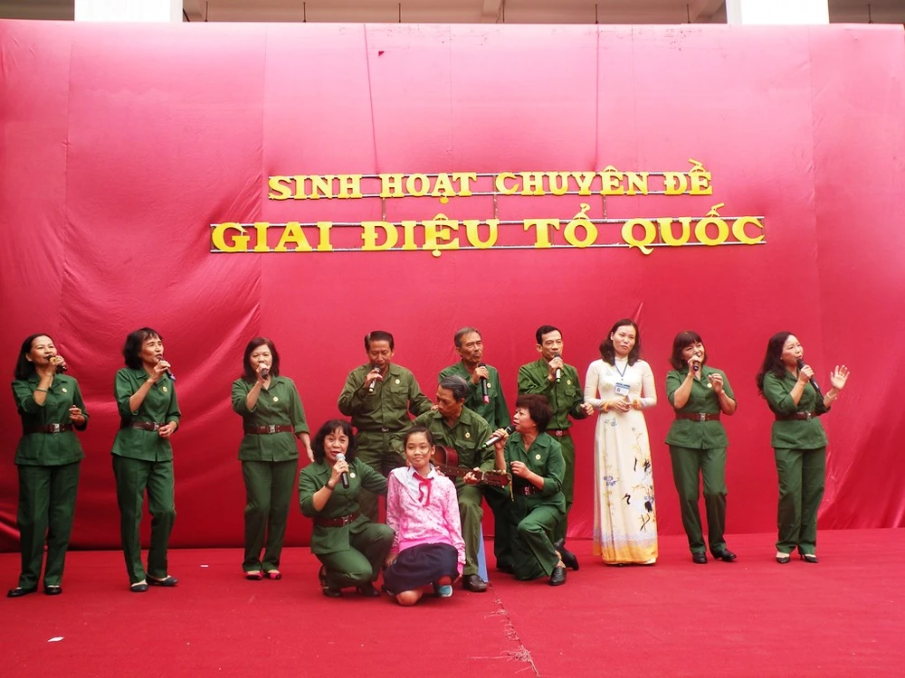 Tham gia buổi sinh hoạt chuyên đề “Giai điệu Tổ quốc”, bên cạnh việc giao lưu với các cô chú Hội Cựu chiến binh, các em còn được thưởng thức những ca khúc đi cùng năm tháng. Đặc biệt, các em còn có cơ hội tìm hiểu kiến thức liên quan về biển đảo quê hương qua những panô trưng bày giữa sân trường.