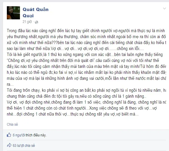 Tôi là kẻ giết người, là 1 thứ không xứng ngang với con súc vật.Bên tai luôn nghe thấy tiếng “Chồng ơi, vợ yêu chồng nhất trên đời mà Quát ơi”.
