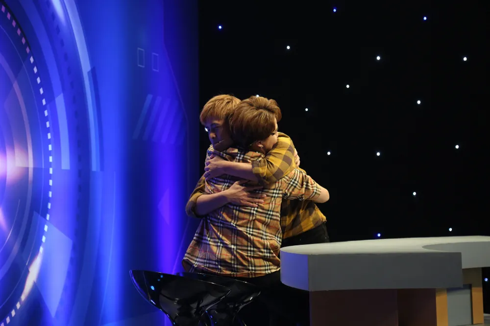 Gin Tuấn Kiệt ôm Duy Khánh trên sóng truyền hình. Ảnh: BEE