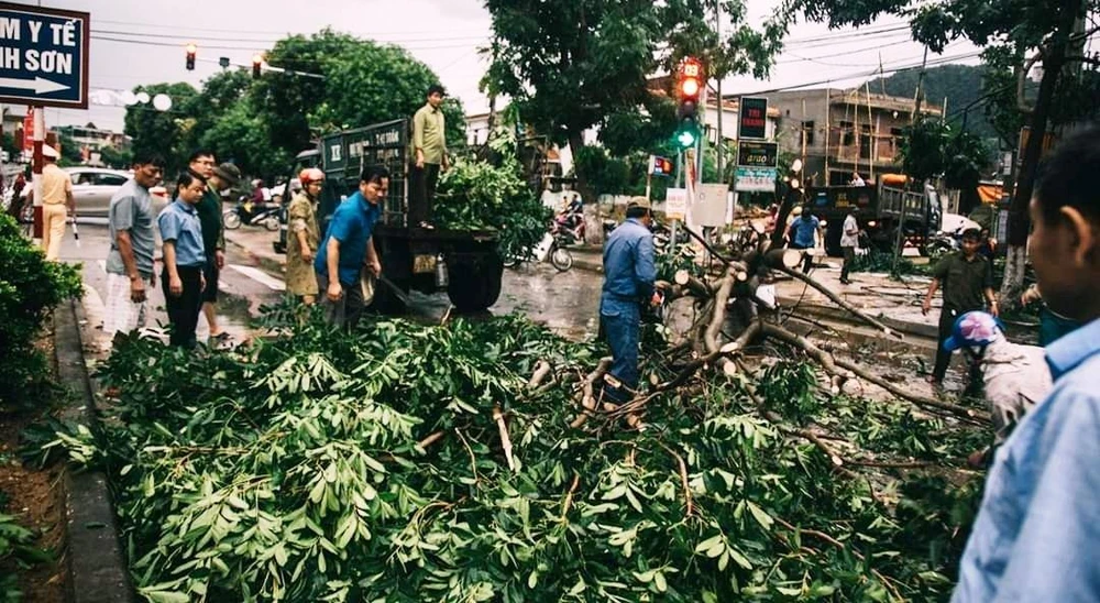 Hiện lực lượng công an, quân đội, dân quân, thanh niên, người dân đang thu dọn cây đổ, lợp lại mái nhà cho những nhà bị thiệt hại.