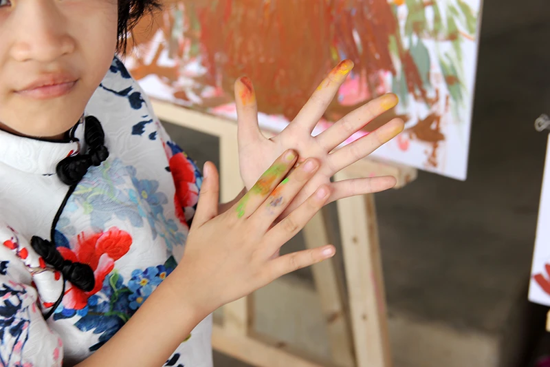 Bàn tay dính đầy màu sơn khi các em hoàn thành bức tranh của mình.