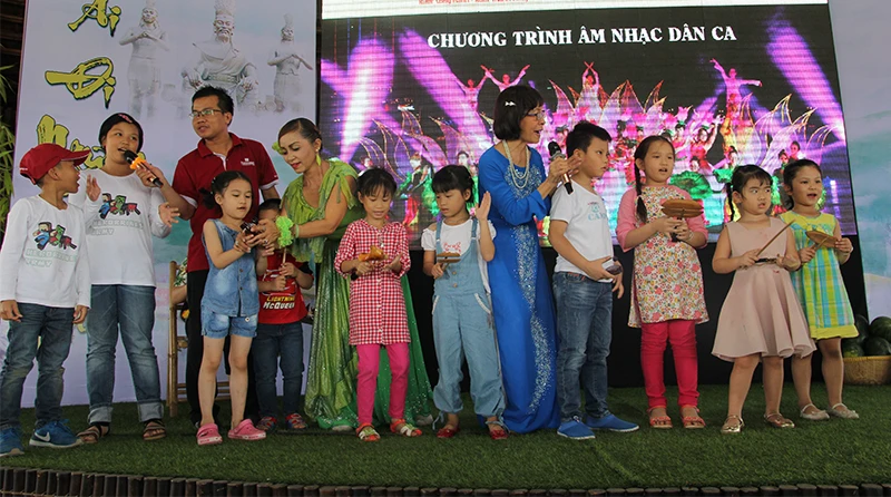Gần 100 gia đình cùng đưa các con nhỏ đến tham gia buổi nói chuyện thú vị tìm hiểu về ngày quốc tổ mùng 10 tháng 3 tại khu đô thị Làng sen Việt Nam (tỉnh Long An).