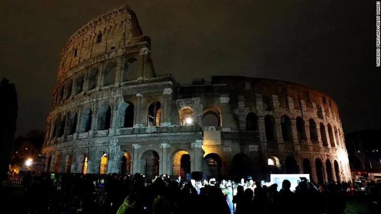 Đại hý trường La Mã ở Rome (Ý) chìm trong bóng tối trong Giờ Trái Đất năm 2018. Ảnh: CNN
