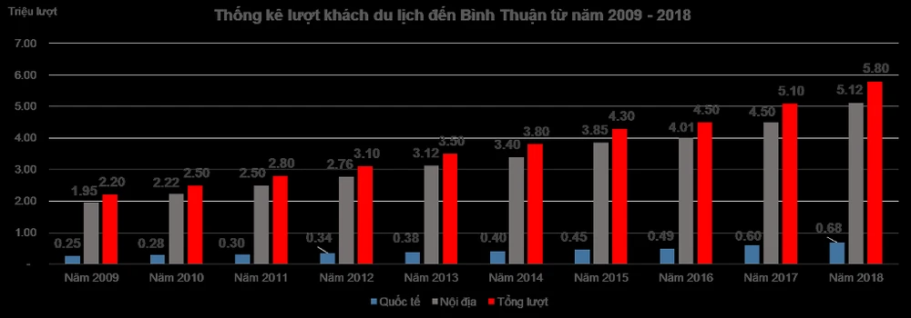 Năm 2018, Bình Thuận đón 5,8 triệu lượt khách, mang về khoảng 13.000 tỉ đồng doanh thu. Nguồn: Tổng cục Thống Kê