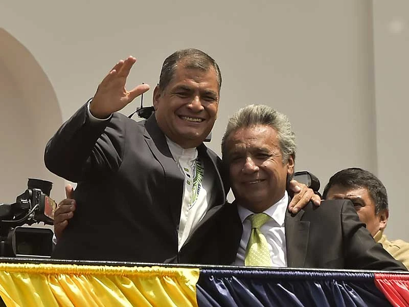 Tổng thống Ecuador Rafael Correa chúc mừng chiến thắng của người kế nhiệm Lenin Moreno (phải). Ảnh: AFP