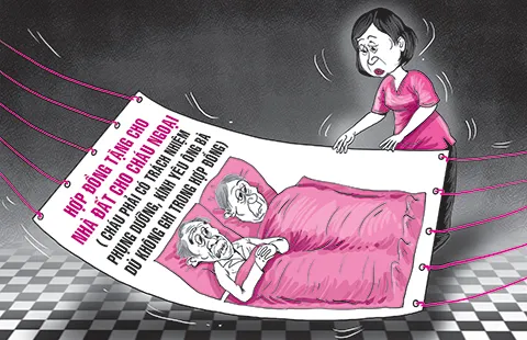 Tháng 3-2010, vợ chồng cụ Trần Thị Xăng kiện chị Phan Thị Cẩm Vân (cháu ngoại) ra TAND huyện Đức Hòa (Long An) để đòi lại nhà đất. Trong đơn khởi kiện, vợ chồng cụ Xăng trình bày rằng hai cụ già yếu, không còn sức lao động nên cho chị Vân về sống chung. Chị Vân hứa sẽ chăm sóc, phụng dưỡng hai cụ đến khi qua đời. Vì vậy, tháng 5-2007, hai cụ đã làm hợp đồng tặng cho chị Vân toàn bộ 297 m2 đất cùng nhà cửa gắn liền với đất (trong hợp đồng không ghi điều kiện phụng dưỡng - NV).