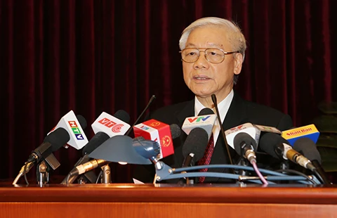 Tổng Bí thư Nguyễn Phú Trọng phát biểu bế mạc hội nghị. Ảnh: TTXVN