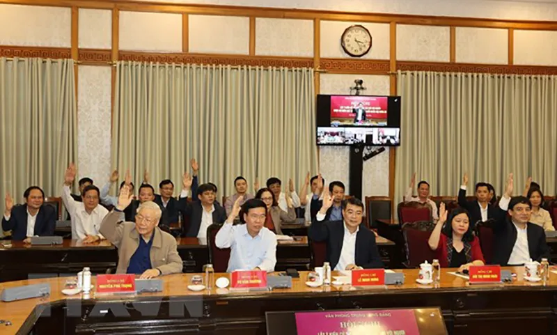 Tổng Bí thư, Chủ tịch nước Nguyễn Phú Trọng và các đại biểu giơ tay biểu quyết tại hội nghị. Ảnh: TTXVN