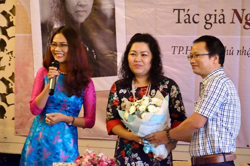 Nhà văn Trần Nhã Thụy và nhà thơ Phương Huyền tặng hoa cho tác giả Nguyên Trân (giữa).