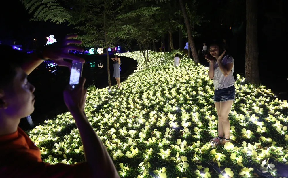 Tạo dáng chụp ảnh giữa cánh đồng hoa hồng rực sáng bởi hiệu ứng đèn LED.