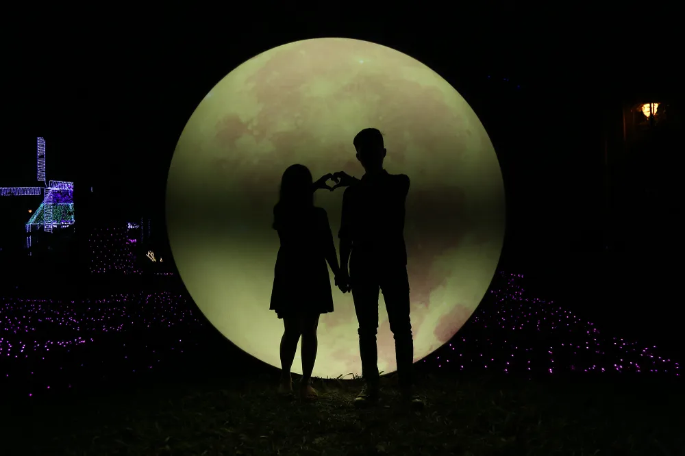 Hai bạn trẻ tạo dáng chụp ảnh với hiệu ứng đèn LED mặt trăng.