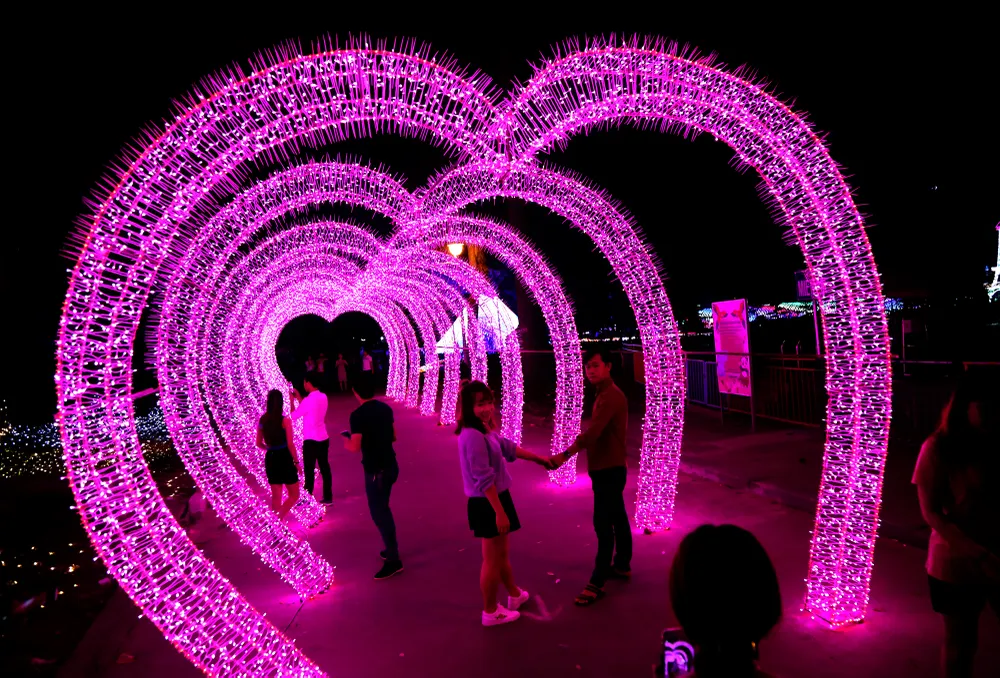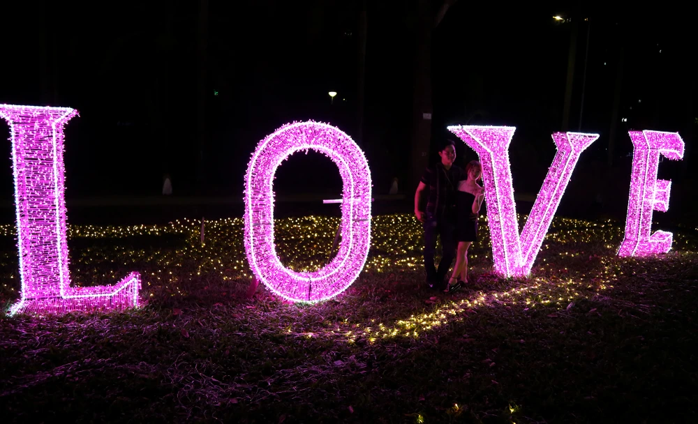 Hai bạn trẻ tạo dáng lãng mạn bên cạnh mô hình đèn LED tình yêu.