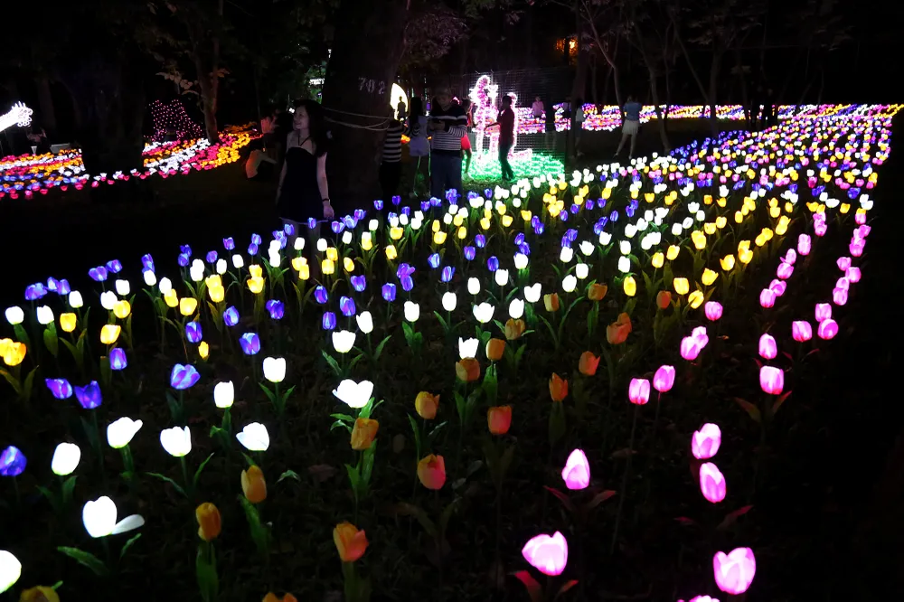 Cánh đồng hoa tulip đủ màu sắc rực sáng trong đêm.